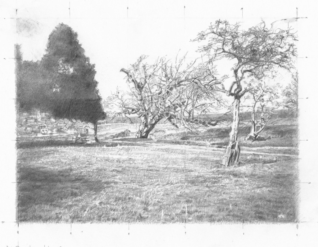 As Gore worked in colour and my work is monochrome, I felt that a different interpretation was really needed. If I was going to spend time on this, I needed something that would excite me. The trees in Gore’s picture were not really playing with the light as I would like, and Gore’s composition, although working well with his palette, was structurally uninteresting. However, a couple of ideas started to form. One would be to execute a quick study using a looser way of working which I had adopted during lockdown- which gave a sense of energy and movement. The other idea was to turn my back on the scene, to go to the oaks which stood behind us and work with those. The oaks felt precious, semi wild and would have sheltered Gore as he painted the scene. I could feel the sense that this was ‘right’ starting to flow. It would be two pictures, one ‘me’ and one ‘him’, back and forth across a century.