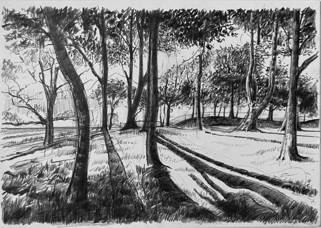 At Chanctonbury Ring: Figures walking towards each other, or parting? Life and death held in the Beeches, regenerating. Nearby, Ashes with dieback line the Way.