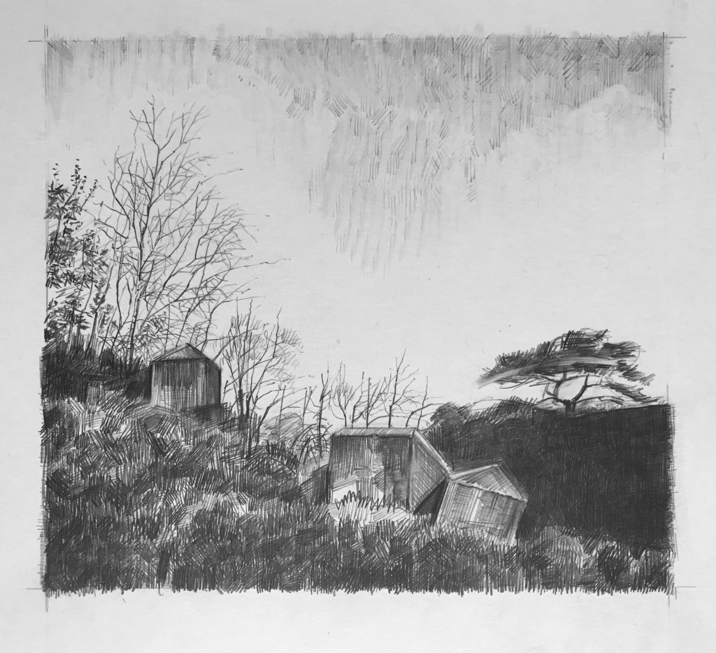 Edge of the Wood, Applehayes- Looking Back, Graphite on Bristol Board, 18 x 34 cm , © Paul Newman (sold)